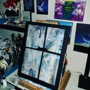 Fotokunst-Unikat von Carsten Gebhardt: Ein gemalter schwarzer Fensterrahmen mit realistischen Wassertropfen über einer Fotografie eines Lost-Place-Graffitis in den Noltemeyer Werken.